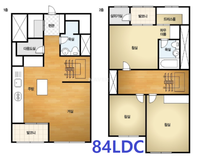다자녀 2가구와 신혼부부 1가구를 모집했던 84LDC 타입은 위에 소개된 84LDB 타입과 구조적으로는 동일한 구조입니다. 다만 이 구조는 현관이 1층에 있어 방으로 가기 위해서는 계단으로 올라가는 형태가 84LDB와 차이점이 있습니다. 이번 청약에서는 다가구 2가구에 1,256명이 신청했고, 신혼부부 1가구에는 2,081명이 신청했습니다.